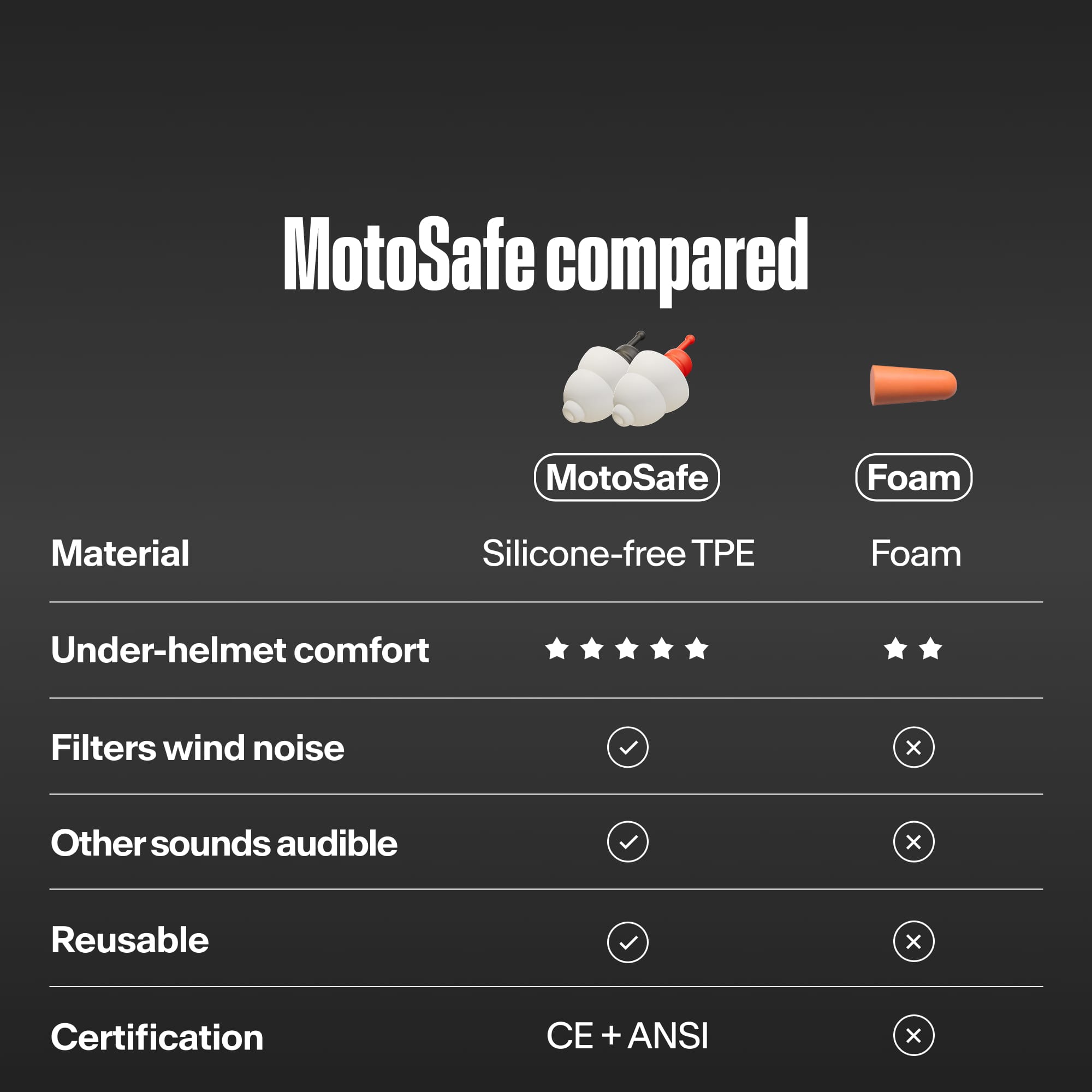 Motorcycle earplugs that reduce wind noise at any speed